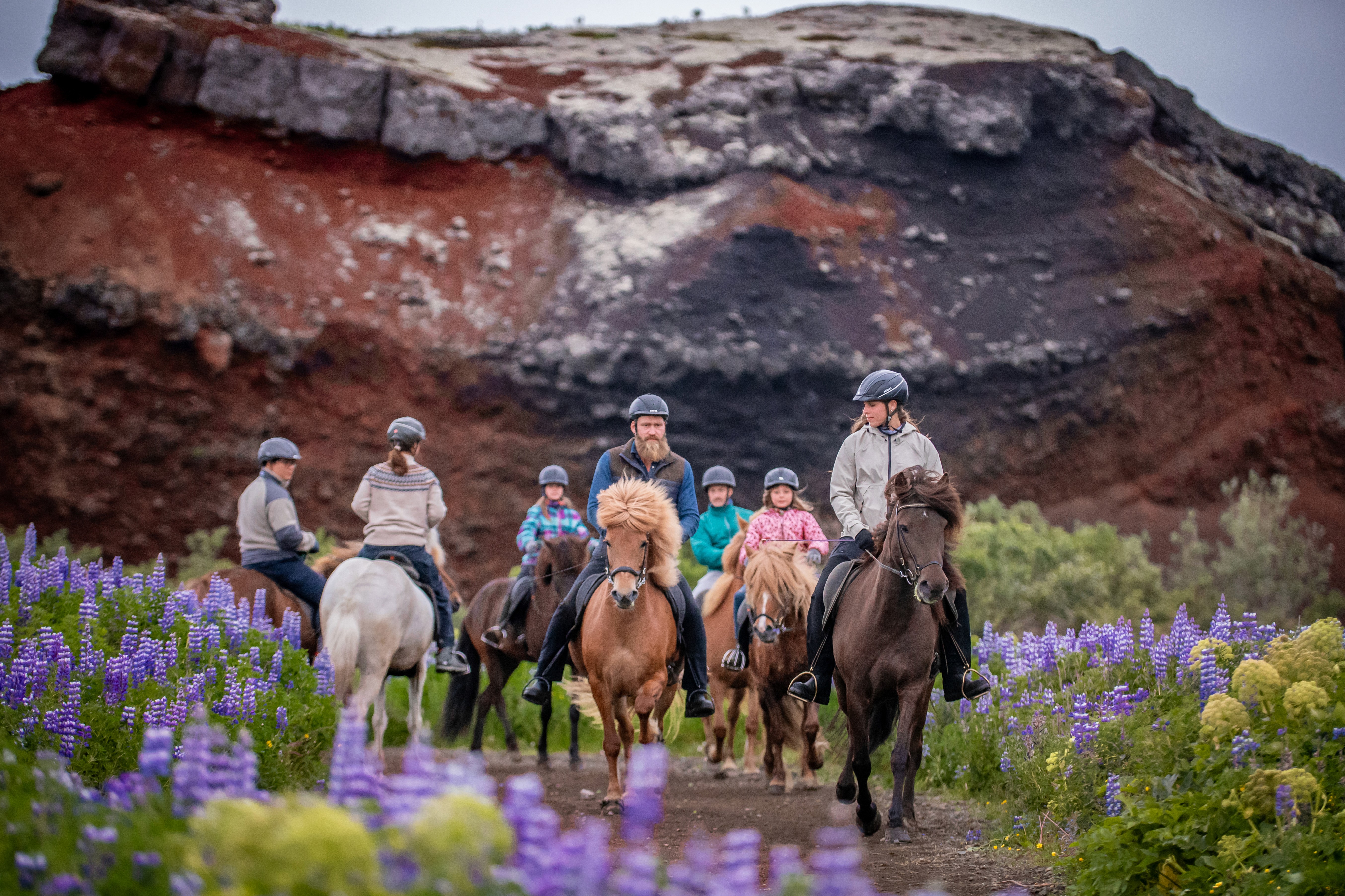Our morning tour takes you through the Hills of Hólmsheiði, fields of purple lupins and lushy forest. Join us, feel the freedom and connect with your horse enjoy the panoramic mountain view surrounding us and the beauty of the Red Hills, a 5200 years old lava formations.